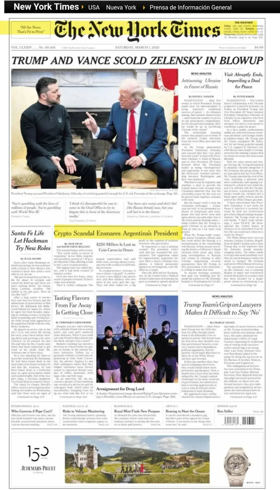 Este sábado, The New York Times decidió que la nota sea la que ocupe el tercer lugar por orden de aparición en la tapa de su edición impresa. De no haber sido por la polémica mundial entre el presidente estadounidense, Donald Trump y su par de Ucrania, Volodimir Zelensky, durante su reunión en la Casa Blanca, el artículo sobre Milei quizás hasta hubiera tenido una preponderancia mayor.